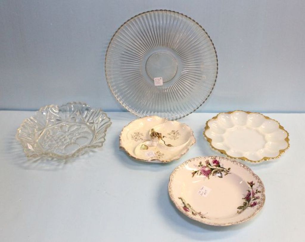 Round glass tray, milk glass egg plate, rose bowl, clear bowl & rose finial plate Round glass tray, milk glass egg plate, rose bowl, clear bowl & rose finial plate