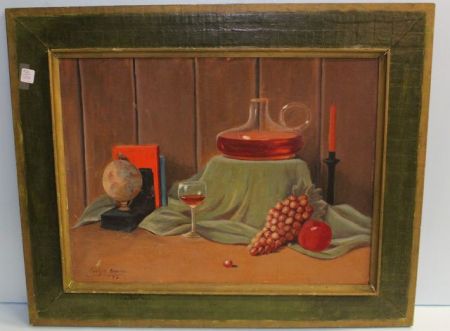 581 Framed Oil on Board of Wine Bottle and Grapes