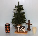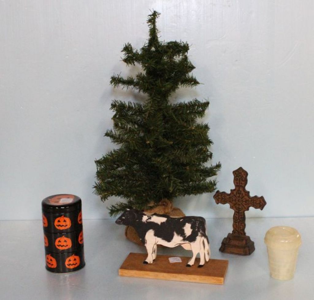 Tabletop Christmas tree, wood cow, tin, plastic jar & metal cross tree; Tree- 21" h. Tabletop Christmas tree, wood cow, tin, plastic jar & metal cross tree; Tree- 21" h.