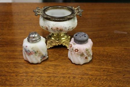 Footed 2 1/2" diameter unmarked dish and two unmarked shakers. Footed 2 1/2" diameter unmarked dish and two unmarked shakers.