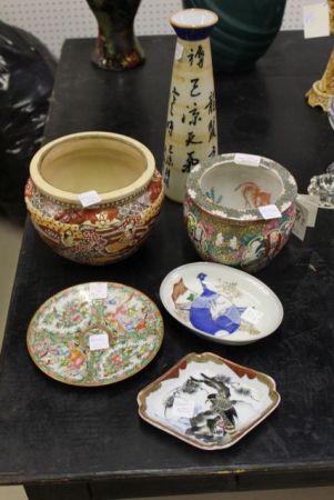 Small oriental fish bowl, 6 1/2" in diameter. Dish with eagle in tree, made in china and measures 7" in diameter. Famille rose dish, satsuma bowl measuring 7" in diameter. Made in China pottery vase measures 12 " in height. Small oriental fish bowl, 6 1/2" in diameter. Dish with eagle in tree, made in china and measures 7" in diameter. Famille rose dish, satsuma bowl measuring 7" in diameter. Made in China pottery vase measures 12 " in height.