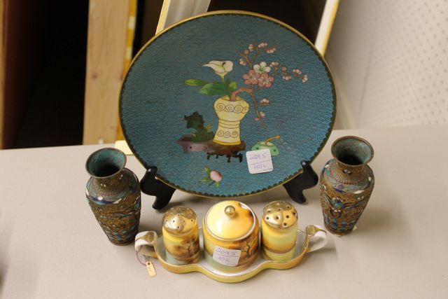 Small cloisonné vases measuring 4" h. A cloisonne plate, and a Japanese condiment set. Small cloisonné vases measuring 4" h. A cloisonne plate, and a Japanese condiment set.