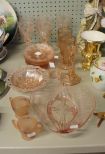 Four pink etched Depression glass glasses, and oval center bowl, creamer, sugar, candlesticks, ten etched saucers and glasses. Four pink etched Depression glass glasses, and oval center bowl, creamer, sugar, candlesticks, ten etched saucers and glasses.