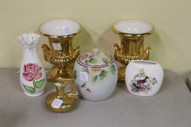 Pair of English Royal Winton urns, 7"{ h. 22K Gold pitcher, 3" h. Small vase with birds, milk glass vase with roses and covered jar. Pair of English Royal Winton urns, 7"{ h. 22K Gold pitcher, 3" h. Small vase with birds, milk glass vase with roses and covered jar.