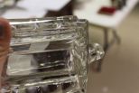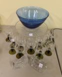 Set of eleven etched 4 1/2" glasses, large blue glass bowl, cake stand, glass tape holder and glass Heisey toothpick holder. Set of eleven etched 4 1/2" glasses, large blue glass bowl, cake stand, glass tape holder and glass Heisey toothpick holder.