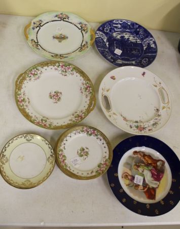 Seven handpainted nippon china plates, 16 1/4" diameter and one 10" transfer plate Victorian in style. Handpainted, cake plate, and blue and white plate, 10" dia. Seven handpainted nippon china plates, 16 1/4" diameter and one 10" transfer plate Victorian in style. Handpainted, cake plate, and blue and white plate, 10" dia.