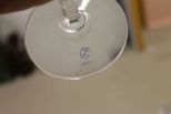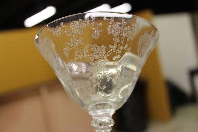 Thirteen various etched glasses, two small etched compotes, etched creamer, press glass bowls, pigeon red creamer and sugar, set of fish dishes and crystal ornament. Thirteen various etched glasses, two small etched compotes, etched creamer, press glass bowls, pigeon red creamer and sugar, set of fish dishes and crystal ornament.