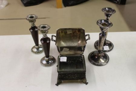 Two pair silver-plate candlesticks, silver-plate dish and jewelry box. Two pair silver-plate candlesticks, silver-plate dish and jewelry box.