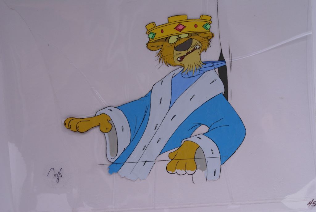 Certified & signed original Walt Disney Productions hand painted movie/film cel, illustrating Prince John from the 1973 Disney animated feature, "Robin Hood." Certified & signed original Walt Disney Productions hand painted movie/film cel, illustrating Prince John from the 1973 Disney animated feature, "Robin Hood."