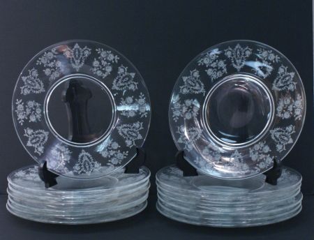 A matched set of fourteen Tiffin "Cherokee Rose" elegant glass 8" luncheon plates, produced in the 1940s-1950s. A matched set of fourteen Tiffin "Cherokee Rose" elegant glass 8" luncheon plates, produced in the 1940s-1950s.
