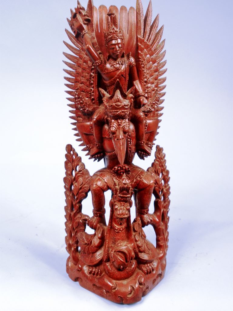 An intricately carved 14"h Balinese statue of Hindu deities showing Vishnu riding winged Garuda, both standing on Chukwa, the first and oldest turtle who swims through the river of milk. Signed on base "Binda Siwa Bali." An intricately carved 14"h Balinese statue of Hindu deities showing Vishnu riding winged Garuda, both standing on Chukwa, the first and oldest turtle who swims through the river of milk. Signed on base "Binda Siwa Bali."