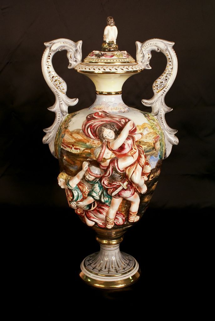 A monumental 25"h Capodimonte lidded urn with phoenix handles, gilded and hand painted in rich colors, showing classical figures finely modeled in deep bas relief against a dense Italian landscape filled with buildings and trees, rivers and bridges. Marked with a Crown-over-C, "Capodimonte, Made in Italy." A monumental 25"h Capodimonte lidded urn with phoenix handles, gilded and hand painted in rich colors, showing classical figures finely modeled in deep bas relief against a dense Italian landscape filled with buildings and trees, rivers and bridges. Marked with a Crown-over-C, "Capodimonte, Made in Italy."