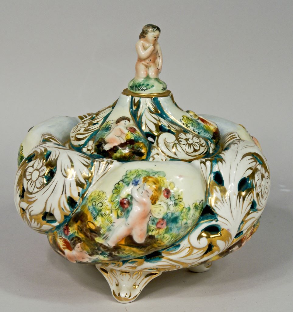 A rarely seen hand painted and gilded Capodimonte potpourri jar, 8"h x 9"w, decorated in bas relief with scenes of playful cherubs. Reticulated body and lid, marked in overglaze gilt "Capodimonte." A rarely seen hand painted and gilded Capodimonte potpourri jar, 8"h x 9"w, decorated in bas relief with scenes of playful cherubs. Reticulated body and lid, marked in overglaze gilt "Capodimonte."