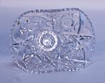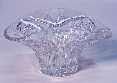 A signed Libbey American Brilliant Cut Glass basket or fruit bowl with rolled edges, 4 1/2"h x 8 1/2"w x 6"d. A signed Libbey American Brilliant Cut Glass basket or fruit bowl with rolled edges, 4 1/2"h x 8 1/2"w x 6"d.
