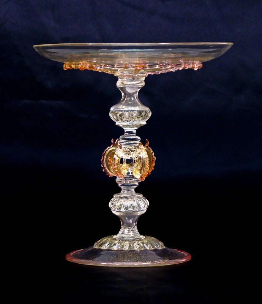 A very fine Venetian art glass "Cypriot" compote of clear aventurine crystal with intricately applied decoration in pink glass at bowl, stem and base rim. In the manner of C.V.M. (Compagnie di Vetri e Mosaici de Venezia e Murano), 7"h x 6 3/4"w. A very fine Venetian art glass "Cypriot" compote of clear aventurine crystal with intricately applied decoration in pink glass at bowl, stem and base rim. In the manner of C.V.M. (Compagnie di Vetri e Mosaici de Venezia e Murano), 7"h x 6 3/4"w.