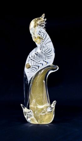 A 10"h Murano Art Glass cockatoo figure with internally striped white filigrana body, and gold aventurine comb, beak and base. Original oval gold foil label, "Made in Italy, Murano, Venezia." A 10"h Murano Art Glass cockatoo figure with internally striped white filigrana body, and gold aventurine comb, beak and base. Original oval gold foil label, "Made in Italy, Murano, Venezia."