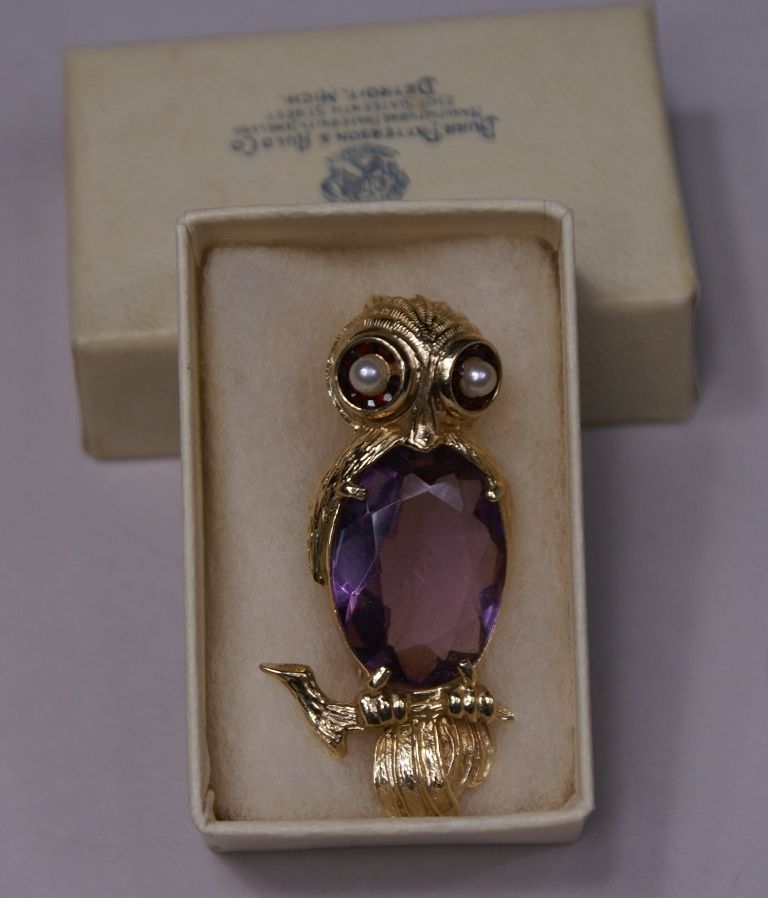 A 14 karat yellow gold 1 5/8" owl pin set with a 19mm x 13mm oval amethyst, two cultured pearls and seventeen round garnets (one garnet missing). A 14 karat yellow gold 1 5/8" owl pin set with a 19mm x 13mm oval amethyst, two cultured pearls and seventeen round garnets (one garnet missing).