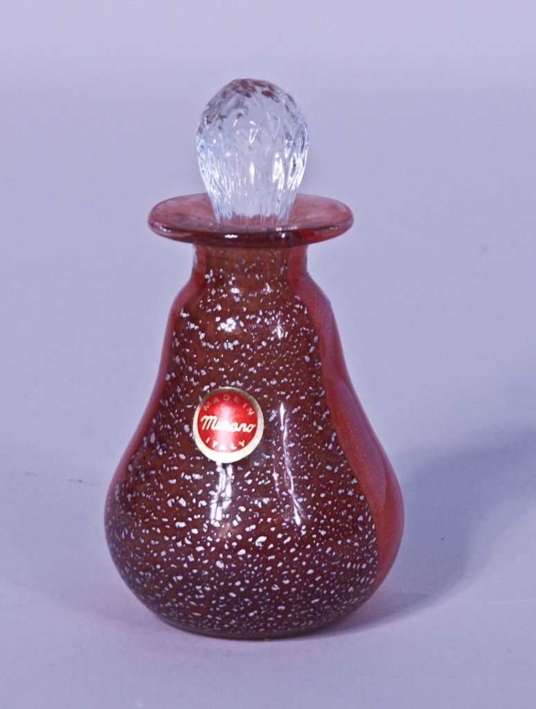 A Murano art glass 5" perfume bottle with original crystal stopper, internally decorated with two shades of evenly divided somerso; on one side gold aventurine flecked, silver on the other. Original red foil circular Murano label. A Murano art glass 5" perfume bottle with original crystal stopper, internally decorated with two shades of evenly divided somerso; on one side gold aventurine flecked, silver on the other. Original red foil circular Murano label.