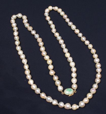 A 33" pearl strand featuring 84 baroque pearls ranging from seven to eight millimeters, closed by a 14 karat yellow gold clasp with a jade accent. A 33" pearl strand featuring 84 baroque pearls ranging from seven to eight millimeters, closed by a 14 karat yellow gold clasp with a jade accent.