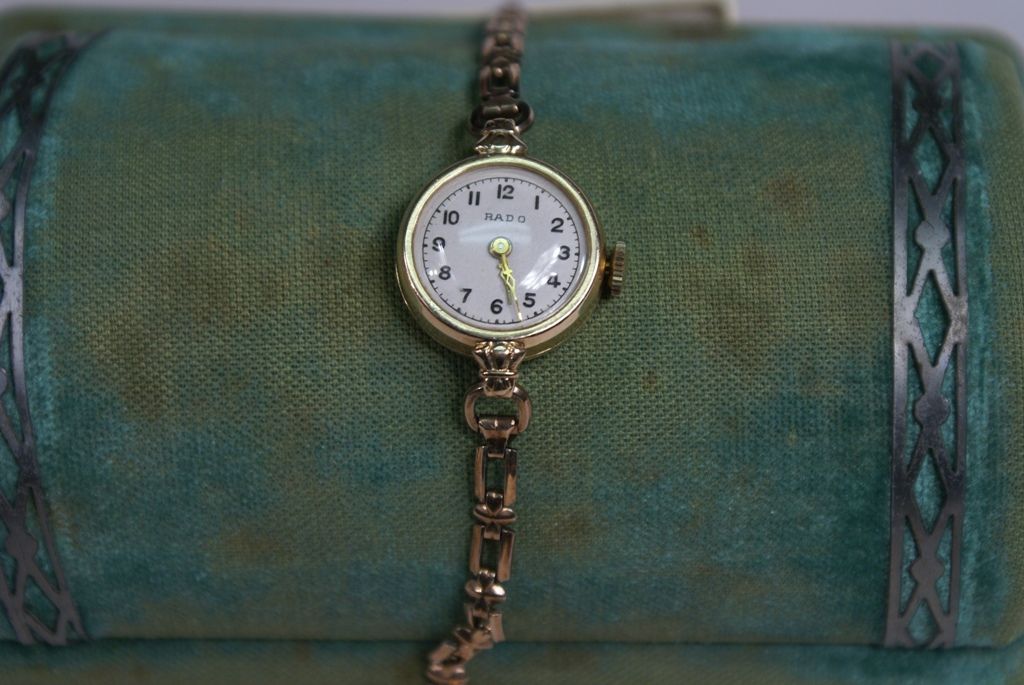 A Rado lady's mechanical movement watch in a 14 karat yellow gold case with two round diamonds, 10k white gold filled band, currently running. A Rado lady's mechanical movement watch in a 14 karat yellow gold case with two round diamonds, 10k white gold filled band, currently running.