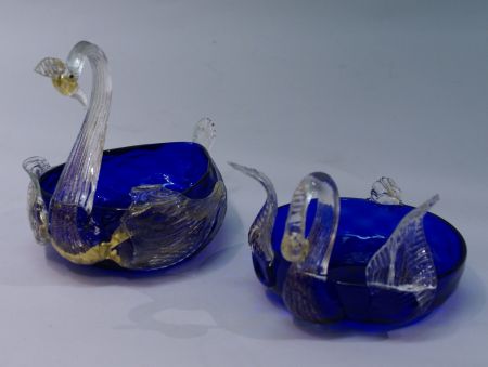 656 Pair of Venetian Art Glass Cobalt Blue Swan Dishes by Aureliano Toso
