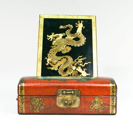 A Chinese 8 1/4" x 11 1/4" black lacquer plaque decorated in two-color gilt with a rampant dragon, together with a 10 1/2" x 6" x 4 1/4" Chinese red leather box with brass mounts showing a dragon and a phoenix chasing a flaming pearl. A Chinese 8 1/4" x 11 1/4" black lacquer plaque decorated in two-color gilt with a rampant dragon, together with a 10 1/2" x 6" x 4 1/4" Chinese red leather box with brass mounts showing a dragon and a phoenix chasing a flaming pearl.