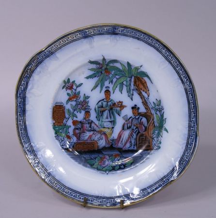 A mid 19th Century Staffordshire flow blue 9" platter with overglaze polychrome decoration, unmarked but in a Chinoiserie pattern typical of early transfer ironstone. A mid 19th Century Staffordshire flow blue 9" platter with overglaze polychrome decoration, unmarked but in a Chinoiserie pattern typical of early transfer ironstone.