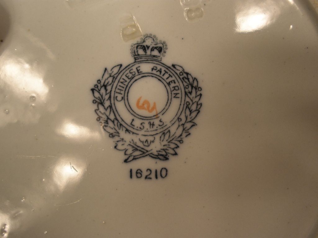 A mid 19th Century Ashworth "Chinese" pattern polychrome flow blue 10" cake plate and four matching 8" BW & Co. "Chinese" plates with additional gilded decoration. The Ashworth plate has a chip to rim. Also included, an Ashworth "Chinese" 11" square x 3 1/4"h tureen, impressed "Ashworth" with a small chip to exterior rim and lightly stained interior crazing. A mid 19th Century Ashworth "Chinese" pattern polychrome flow blue 10" cake plate and four matching 8" BW & Co. "Chinese" plates with additional gilded decoration. The Ashworth plate has a chip to rim. Also included, an Ashworth "Chinese" 11" square x 3 1/4"h tureen, impressed "Ashworth" with a small chip to exterior rim and lightly stained interior crazing.