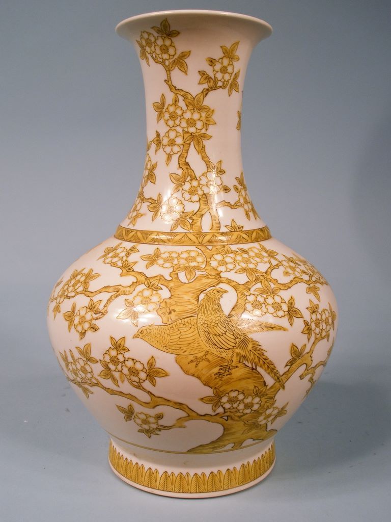 A mid-20th Century Japanese porcelain 13 1/4"h vase hand painted with blossoming cherry trees in chartreuse and black against a pure white background. A mid-20th Century Japanese porcelain 13 1/4"h vase hand painted with blossoming cherry trees in chartreuse and black against a pure white background.