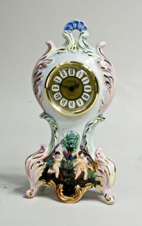 A 9"h Capodimonte boudoir clock with a handpainted and gilded scene of cherubs. Modern quartz movement, late R. Capodimonte Crown-over-Shield decal. A 9"h Capodimonte boudoir clock with a handpainted and gilded scene of cherubs. Modern quartz movement, late R. Capodimonte Crown-over-Shield decal.