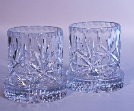 A matched pair of Waterford style cut glass hurricane lamps, each 4 3/4"h with cut glass bases. A matched pair of Waterford style cut glass hurricane lamps, each 4 3/4"h with cut glass bases.