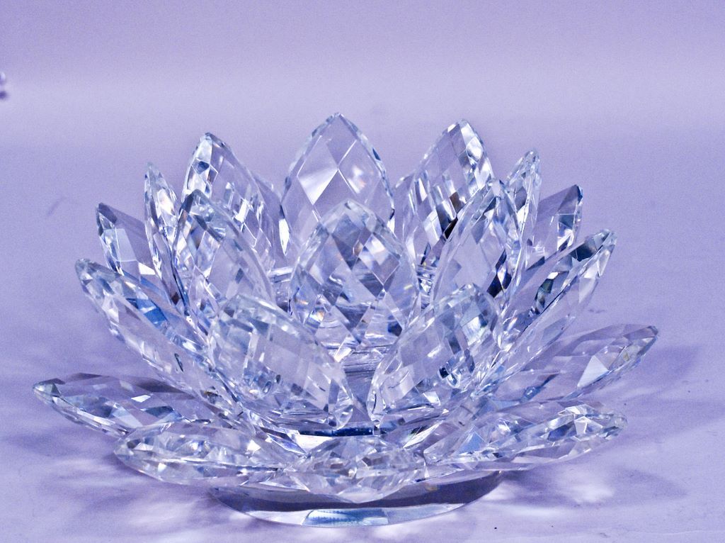 A Mikasa Crystal "Lotus Blossom" bowl, 4 1/2"h x 9" round, created with twenty-four facet cut prism petals in three sparkling tiers. A Mikasa Crystal "Lotus Blossom" bowl, 4 1/2"h x 9" round, created with twenty-four facet cut prism petals in three sparkling tiers.