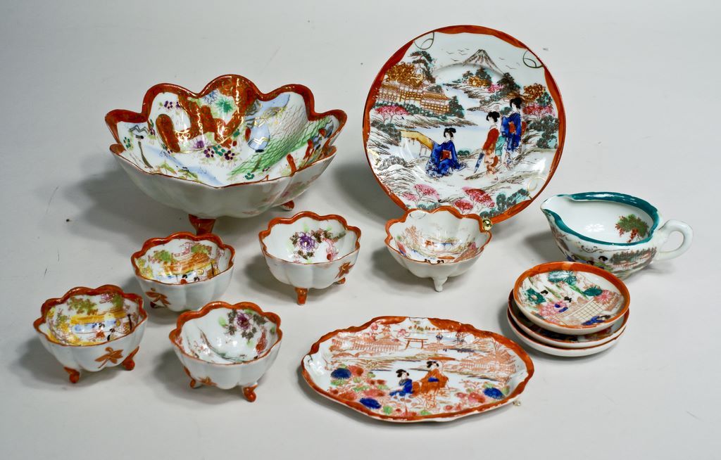 A collection of twelve pieces of Japanese Nagoya eggshell china with hand painted Geisha decoration, including a 7"w footed nut bowl with five matching 3"w individual nut bowls, three 3"w butterpats, a 6" oval tray, a 6" b&b plate, and a 4 1/2"w sauce boat. A collection of twelve pieces of Japanese Nagoya eggshell china with hand painted Geisha decoration, including a 7"w footed nut bowl with five matching 3"w individual nut bowls, three 3"w butterpats, a 6" oval tray, a 6" b&b plate, and a 4 1/2"w sauce boat.