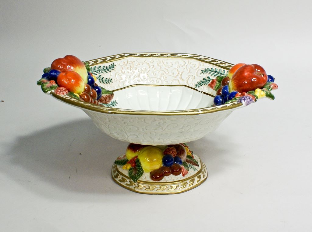 A Fitz & Floyd large pedestal centerpiece, 12 1/2"w x 5"h, decorated in Italian faience style with clusters of brightly colored fruit at handles. Minor losses to gilt trim, matches items #439 and #440 below. A Fitz & Floyd large pedestal centerpiece, 12 1/2"w x 5"h, decorated in Italian faience style with clusters of brightly colored fruit at handles. Minor losses to gilt trim, matches items #439 and #440 below.