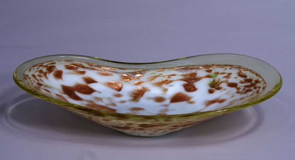 A 1950's Murano oblong bowl of white lattimo glass cased in citrine, with patchlike copper aventurine inclusions. Likely Toso, 11" x 5 1/2" x 2 1/4"h. A 1950's Murano oblong bowl of white lattimo glass cased in citrine, with patchlike copper aventurine inclusions. Likely Toso, 11" x 5 1/2" x 2 1/4"h.