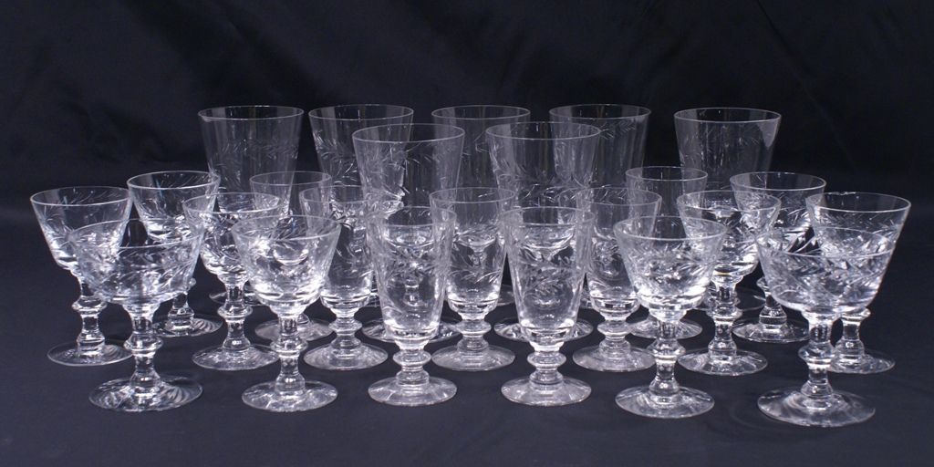 A set of 25 engraved crystal stems in a Swedish-style laurel pattern favored by American elegant glass companies in the 1950s-60s, comprised of seven 5 3/4"h footed tumblers, two 4 3/8" sherbets, eight 4 1/2" wines, two 6" iced teas, and six 6" waters. Nicks to three waters and two wines. A set of 25 engraved crystal stems in a Swedish-style laurel pattern favored by American elegant glass companies in the 1950s-60s, comprised of seven 5 3/4"h footed tumblers, two 4 3/8" sherbets, eight 4 1/2" wines, two 6" iced teas, and six 6" waters. Nicks to three waters and two wines.