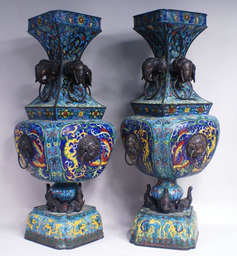 A stunning matched pair of 29"h Chinese cloisonn A stunning matched pair of 29"h Chinese cloisonn