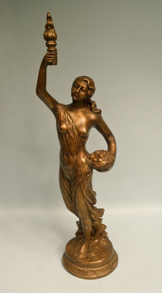 An impressive 26"h bronze Art Nouveau statue of a woman bearing a torch and flowers, no artist's or foundry mark visible. An impressive 26"h bronze Art Nouveau statue of a woman bearing a torch and flowers, no artist's or foundry mark visible.