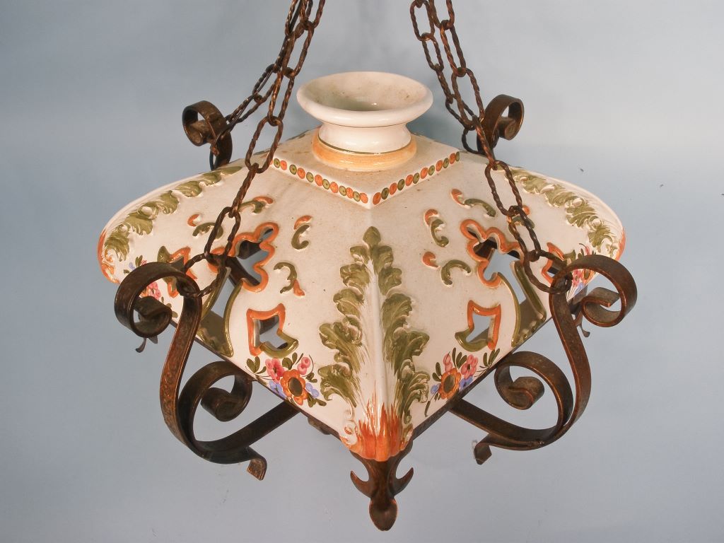 A hand wrought, gilded brass Mission style hanging light fixture, 14 1/2"h x 20"square, with a hand painted Italian openwork faience shade. A hand wrought, gilded brass Mission style hanging light fixture, 14 1/2"h x 20"square, with a hand painted Italian openwork faience shade.