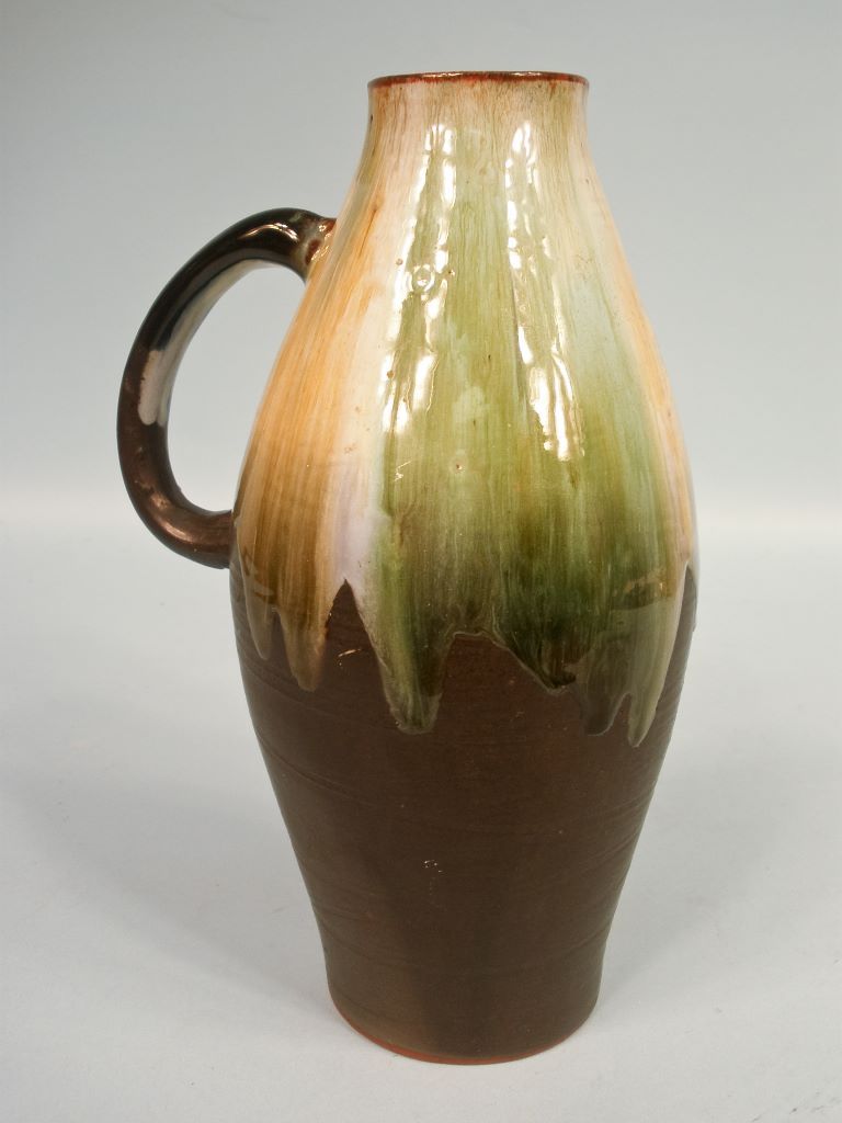 A 10 1/2"h art pottery redware jug with rutile drip glaze, made by Rossa Studio in Tipperary, Ireland. A 10 1/2"h art pottery redware jug with rutile drip glaze, made by Rossa Studio in Tipperary, Ireland.