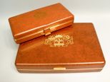 Two leather jewelry boxes, 10" x 7" x 2"h and 8" x 4" x 2"h, the smaller marked "Hickok." Two leather jewelry boxes, 10" x 7" x 2"h and 8" x 4" x 2"h, the smaller marked "Hickok."