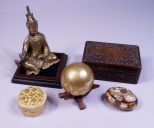 A collection of five India decorative items: A 4" x 6" x 2 1/2"h carved wooden box with brass inlay, a 1 1/4"h x 2 1/2" hexagonal gold-leafed laquerware box with bird & floral decoration, a 3" x 2" oval bone snuff box with brass inlay, a gilded 3" brass decorative ball on wooden stand, and an old cast brass figure of a bodhitsattva on a wooden stand. A collection of five India decorative items: A 4" x 6" x 2 1/2"h carved wooden box with brass inlay, a 1 1/4"h x 2 1/2" hexagonal gold-leafed laquerware box with bird & floral decoration, a 3" x 2" oval bone snuff box with brass inlay, a gilded 3" brass decorative ball on wooden stand, and an old cast brass figure of a bodhitsattva on a wooden stand.