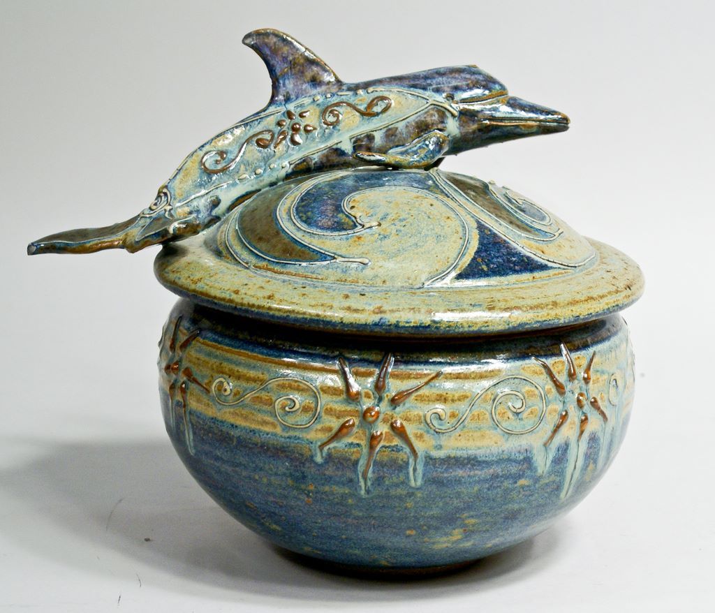 A studio pottery stoneware covered casserole with a finely modeled dolphin handle, 8"h x 10"w, decorated with raised sgraffito scrolling against blue, lavender and amber glazes. The casserole has a small flake to the tip of one tail fin, and a larger chip to the dorsal fin -- the piece cleanly broken and taped to interior of bowl. Mark unclear, possibly "don c 2000." A studio pottery stoneware covered casserole with a finely modeled dolphin handle, 8"h x 10"w, decorated with raised sgraffito scrolling against blue, lavender and amber glazes. The casserole has a small flake to the tip of one tail fin, and a larger chip to the dorsal fin -- the piece cleanly broken and taped to interior of bowl. Mark unclear, possibly "don c 2000."
