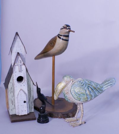 A carved and hand painted folk art shore bird, 12 1/4"h on a 9 1/2" x 6 1/2" base, signed "NM 1984", together with a 7"h gold & turquoise figure of a pelican, a 5 1/2"h Chinese carved horn bird, and an 11 1/2"h handcrafted church birdhouse. A carved and hand painted folk art shore bird, 12 1/4"h on a 9 1/2" x 6 1/2" base, signed "NM 1984", together with a 7"h gold & turquoise figure of a pelican, a 5 1/2"h Chinese carved horn bird, and an 11 1/2"h handcrafted church birdhouse.