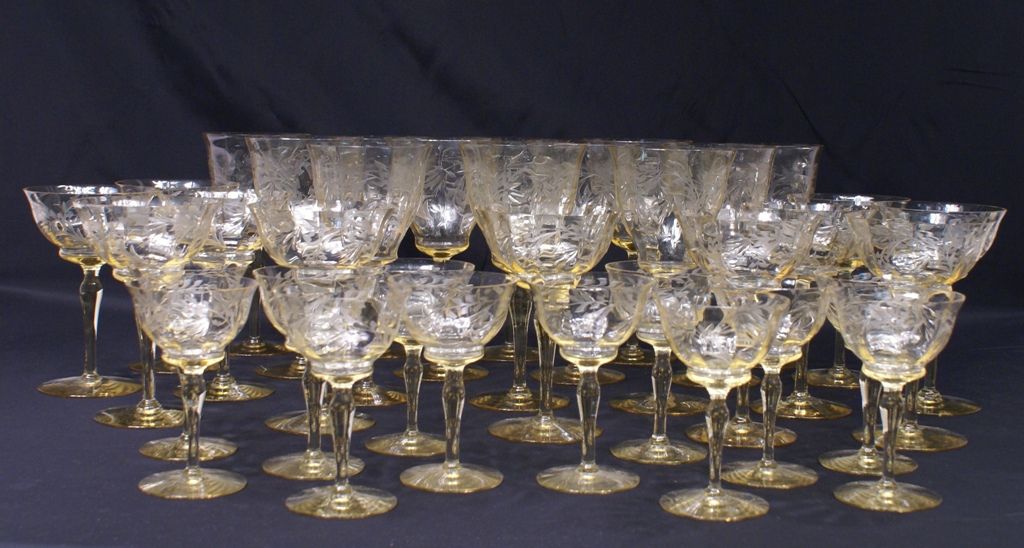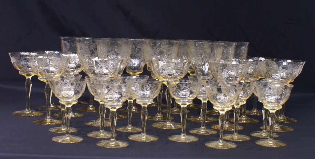 A 1920s matching thirty-five piece set of Elegant Glass floral engraved stems in topaz yellow with optic bowls, comprised of 12 waters, 11 sherbet/champagnes, and 12 wines. Rim chips to four stems. A 1920s matching thirty-five piece set of Elegant Glass floral engraved stems in topaz yellow with optic bowls, comprised of 12 waters, 11 sherbet/champagnes, and 12 wines. Rim chips to four stems.