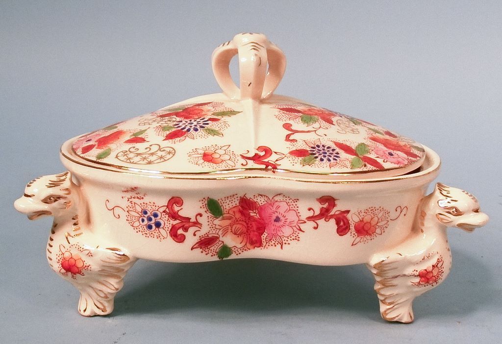 A 1920's Japan divided candy dish in Imari colors on three winged phoenix feet, 8 1/4"w x 5 1/2"h. A 1920's Japan divided candy dish in Imari colors on three winged phoenix feet, 8 1/4"w x 5 1/2"h.