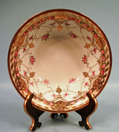 A hand painted, gilded and jeweled 10" x 3 3/4" bride's bowl with "M-in-Wreath" Noritake Nippon mark. A hand painted, gilded and jeweled 10" x 3 3/4" bride's bowl with "M-in-Wreath" Noritake Nippon mark.