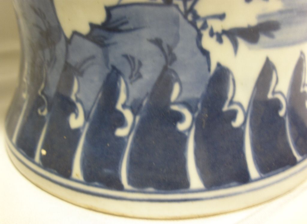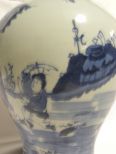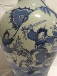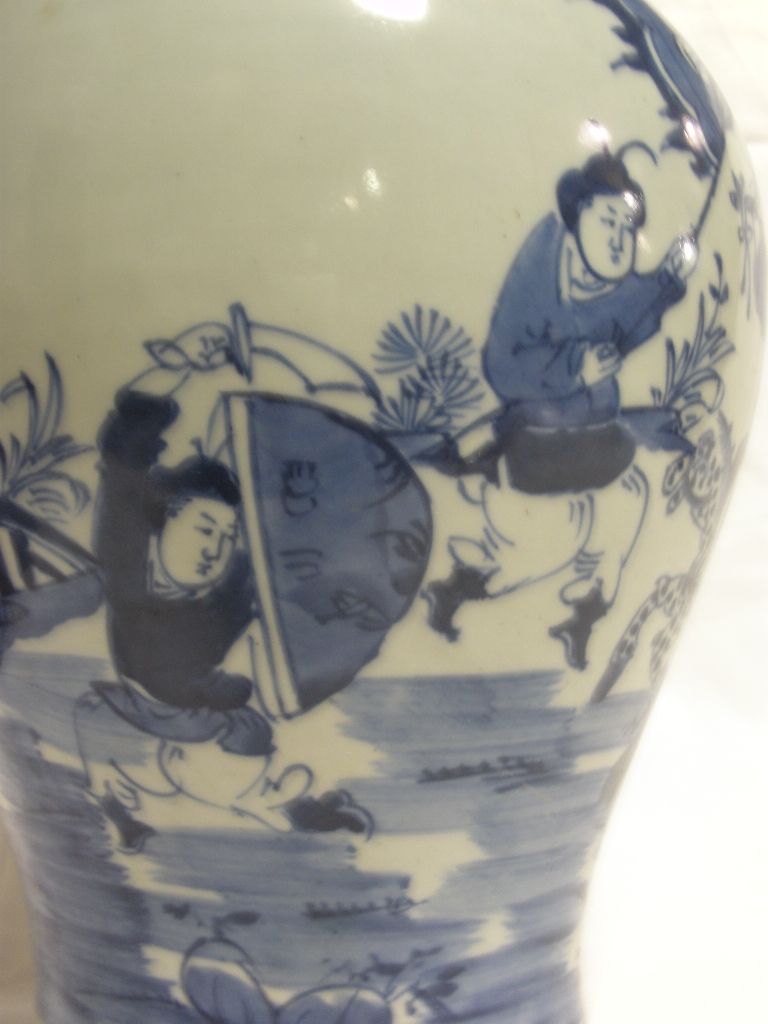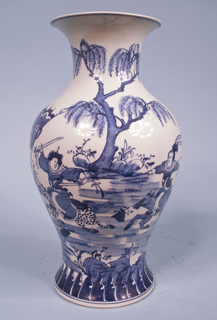 A 14 1/2"h Chinese baluster form blue and white porcelain vase decorated with battling warriors on horseback, marked with an early Ching Dynasty K'ang Hsi Reign (1622-1722) six character seal. A 14 1/2"h Chinese baluster form blue and white porcelain vase decorated with battling warriors on horseback, marked with an early Ching Dynasty K'ang Hsi Reign (1622-1722) six character seal.