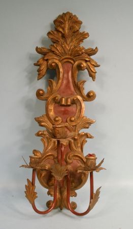 A modern Italian gilt gesso three-lite wall sconce, 25"h x 9 1/2"w, with an elaborately carved & gilded backplate, and brass leaf-shaped candle fonts. A modern Italian gilt gesso three-lite wall sconce, 25"h x 9 1/2"w, with an elaborately carved & gilded backplate, and brass leaf-shaped candle fonts.