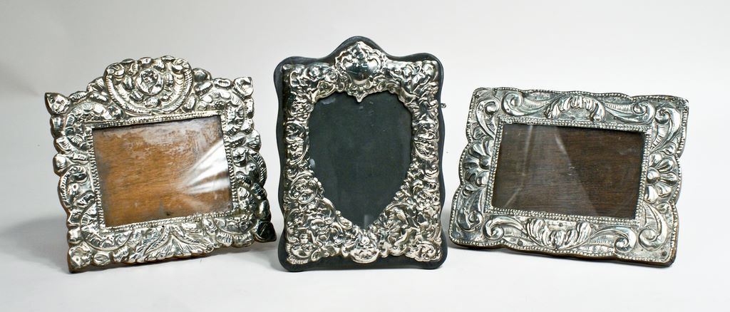 Three Silver Frames: One 7 1/2" x 7 3/8"; the second 8" x 6"; and the last 8" x 5 3/4" frame with an ornately embossed silver cherubs border (fitting 4 x 5 1/4" photo). One of the frames is marked sterling, no marks found on the remaining two though likely sterling as well. Three Silver Frames: One 7 1/2" x 7 3/8"; the second 8" x 6"; and the last 8" x 5 3/4" frame with an ornately embossed silver cherubs border (fitting 4 x 5 1/4" photo). One of the frames is marked sterling, no marks found on the remaining two though likely sterling as well.
